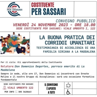 L’esperienza di integrazione di una famiglia siriana che, fuggita dalla sua patria, ha trovato ospitalità e sostegno a La Maddalena. La racconterà domani, venerdì 24 novembre, nella sede della Costituente per Sassari, don Domenico Degortes, parroco emerito dell’isola maddalenina, relatore del seminario “La buona pratica dei corridoi umanitari”. Una testimonianza delle possibilità offerte dai corridoi umanitari, uno dei modelli di accoglienza che gli Stati Europei hanno a disposizione per strappare i migranti dai “viaggi della morte” e farne vittime dei trafficanti di esseri umani. In Sardegna , quello della famiglia siriana che vive a La Maddalena è uno dei pochissimi casi, finora, che ha visto richiedenti asilo ottenere la residenza.